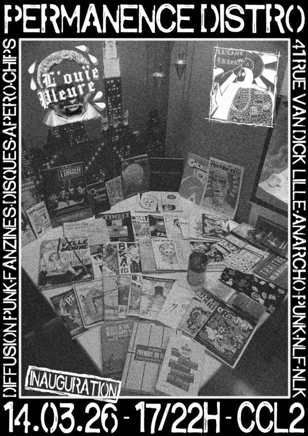 Salut à tous et toutes. Louie Pleure (label/distro/orga de concerts diy et antifasciste) et Lucanedistro (distro non profit de littérature et de créations punk etpolitique) s’associent samedi 14 mars prochain de 17h à 22h. L’idée étant de filer la main… Continue Reading →